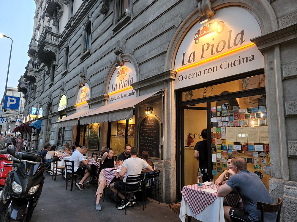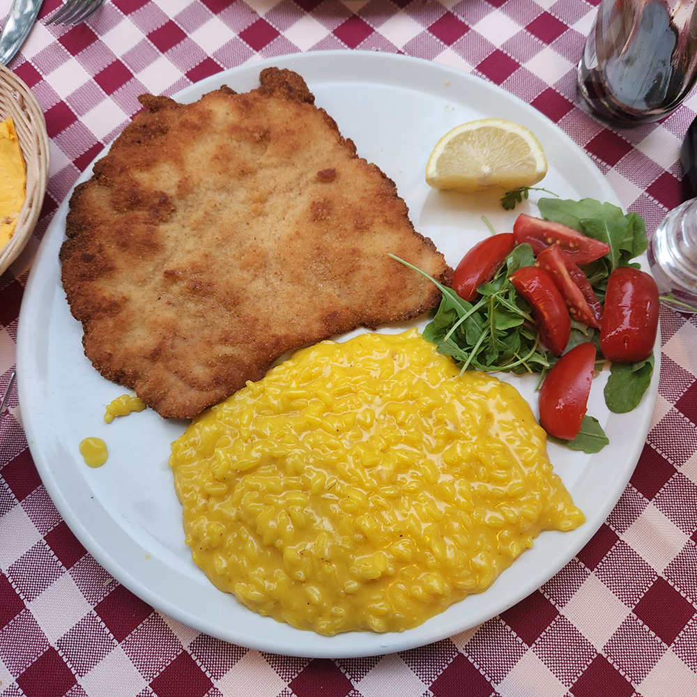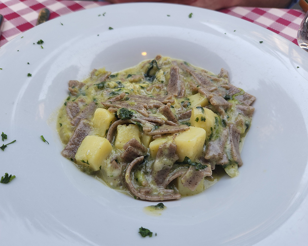 The rural, pastoral Valtellina is a world away from Milan, high in the mountains and bordering Switzerland. Milan is a cosmopolitan city featuring food from all over the world and from the many regions of Italy, but even there, you have to do a little digging to find this dish from the far north of the region. Our favorite place for stick-to-your-ribs local Lombardian food is La Piola in Milan (Viale Abruzzi, 23 – 20131 Milano). The restaurant has been in business for over 70 years and its specialties are the unique, hearty dishes of Lombardy, like pizzoccheri. Their rendition of Pizzoccheri was rich and sumptuous, though since we visited over the summer, we did not have the same warm-food-on-a-cold-day comfort. However, it is good to know that you can get it year round! Not only can you get Pizzoccheri at La Piola, but also the famous Risotto Alla Milanese – bright gold from saffron – and breaded veal Cotoletta alla Milanese, alongside lesser known dishes like Sciatt (fried cheese fritters from Valtellina). The desserts are also scrumptious, and include the local specialty cornmeal cake Sbrisolona.