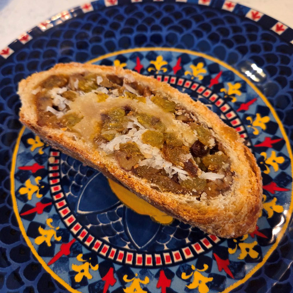The name of this sweet treat appears to be spelled a myriad of ways between standard Italian and Calabrian (and even then, not terribly standard). We saw it spelled as Pitta ‘Mpigliata, Pitta ‘nchiusa, Pintinchuisa, among others. Pintinchuisa, as it is spelled at Enrico’s, is a flaky rolled rosette-shaped pastry filled with raisins, nuts, and warming spices like cinnamon. Enrico’s version also had coconut, which seems to be a special touch. Though different in appearance, in some ways Pintinchuisa reminds me of the traditional Sicilian Christmas cookie, cuccidati, also filled with nuts, citrus peel, and spices. Much like cuccidati, pintinchiusa are commonly eaten at Christmastime. This Christmas we might even consider adding it to our repertoire! You can find recipes for Pintinchuisa at Italian Food Forever, Great Italian Chefs, and Sonia Peronaci (in Italian).