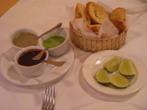 It was 7pm when I made the short walk from Veracruz’ zócalo to La Estancia. I was the only diner in the restaurant at the time (7pm is far too early for dinner for most Mexicans), but was served promptly and courteously. I ordered quickly – a molcajete of enchilada meat, cooked in a green salsa base. The server took my order, and then immediately brought out my complimentary appetizers: a strangely crumbly piece of bread (as opposed to the typical tortillas) served with three different dipping salsas. The bread was completely incompatible with the salsas, full of holes that let the sauces fall through, but as the only things on the table I had no choice but to put them together. I picked away at the bread and the salsas, testing out their different flavor combinations, when my molcajete finally arrived.