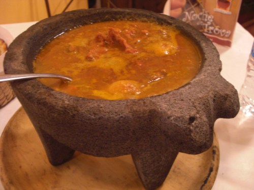 One thing I have always appreciated about Mexican cuisine in general is the way a number of different sauces and spices are incorporated that allow the eater to experience a variety of different flavor combinations inside the same meal. This was no different. The molcajete, by itself, was absolutely delectable. The nopal gave the meat and sauce an acidic finish, leaving your taste buds tingling just enough to get more. But with that, one could combine any or all of the three salsas, which seemed to take on different flavors than when eaten alone. One made the molcajete almost unbearably spicy, another gave it a cooler, lime flavor; and the third (a disappointment) didn’t seem to do much at all. All in all, the meal was large, hearty, and outside the weird bread, a fantastic culinary experience. The best part? The price – a meal easily large enough for two people cost a total of 90 pesos (around $9 US).