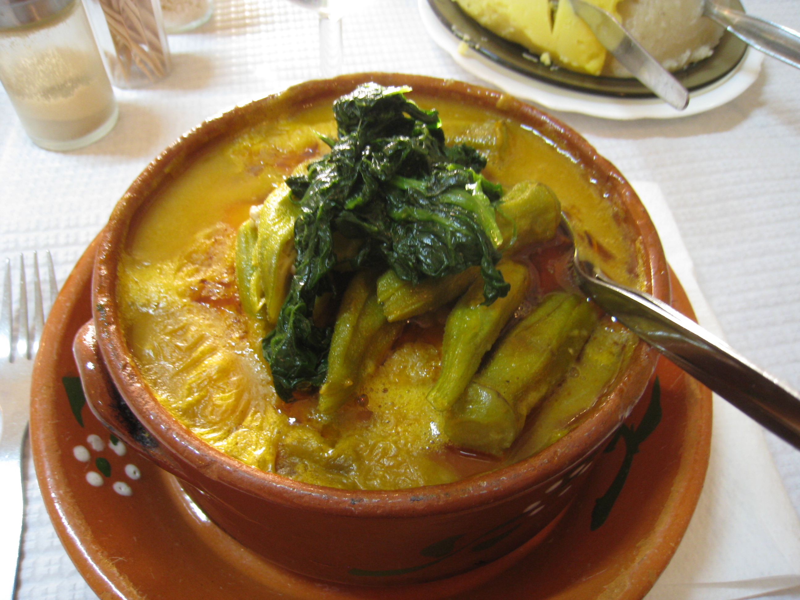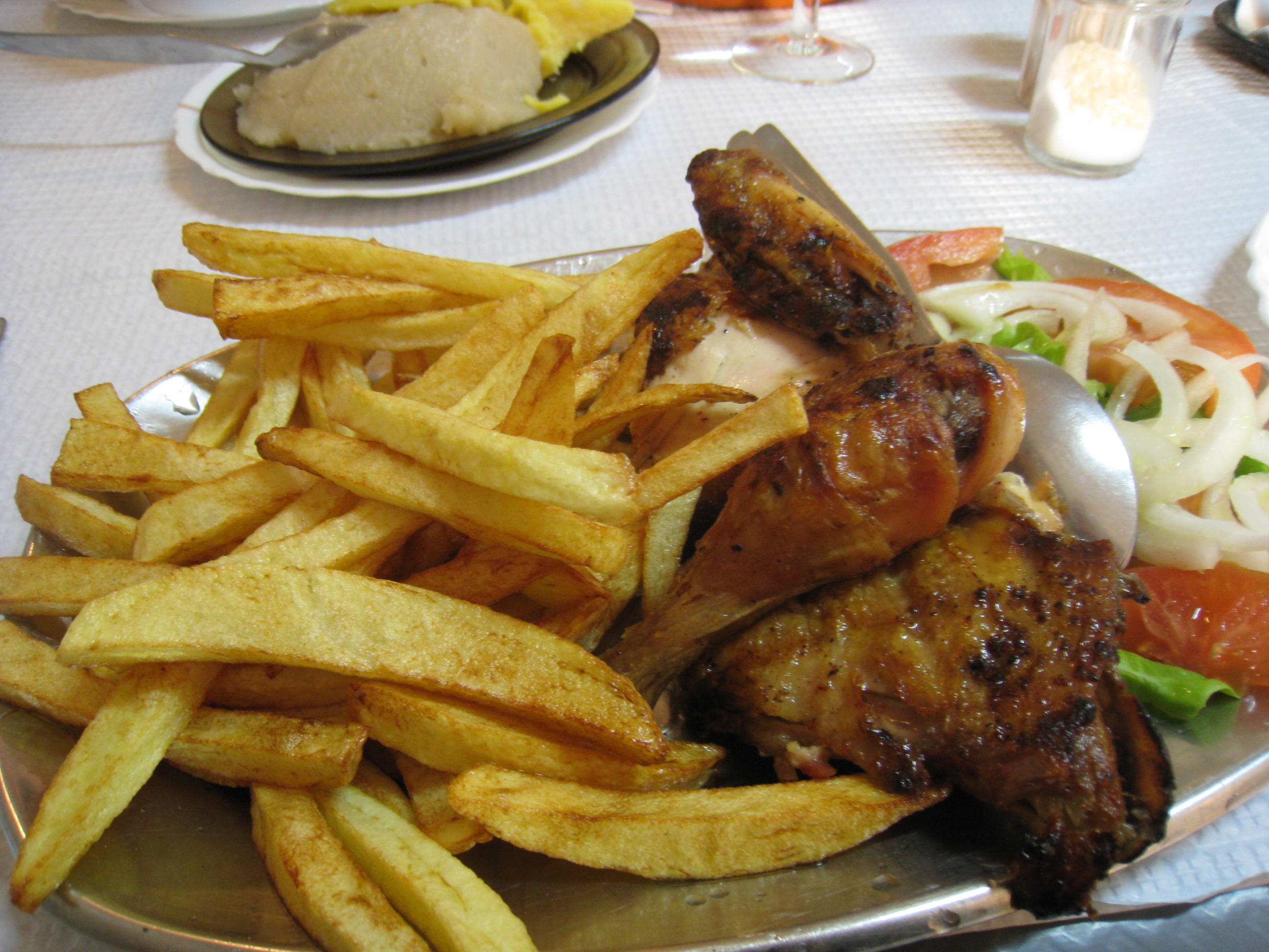 Moamba will remind the first-timer of other rich stews from the western African coast: a thick, oily dish of chicken stewed with tomatoes, okra, potatoes, and collard greens in a slightly spicy sauce. It is served with generous portions of tapioca and a yellow flour mash, similar to Nigerian fufu. Even the half-portion we ordered (9 euros), when combined with the tapioca, was far more than what was needed for the two of us.
