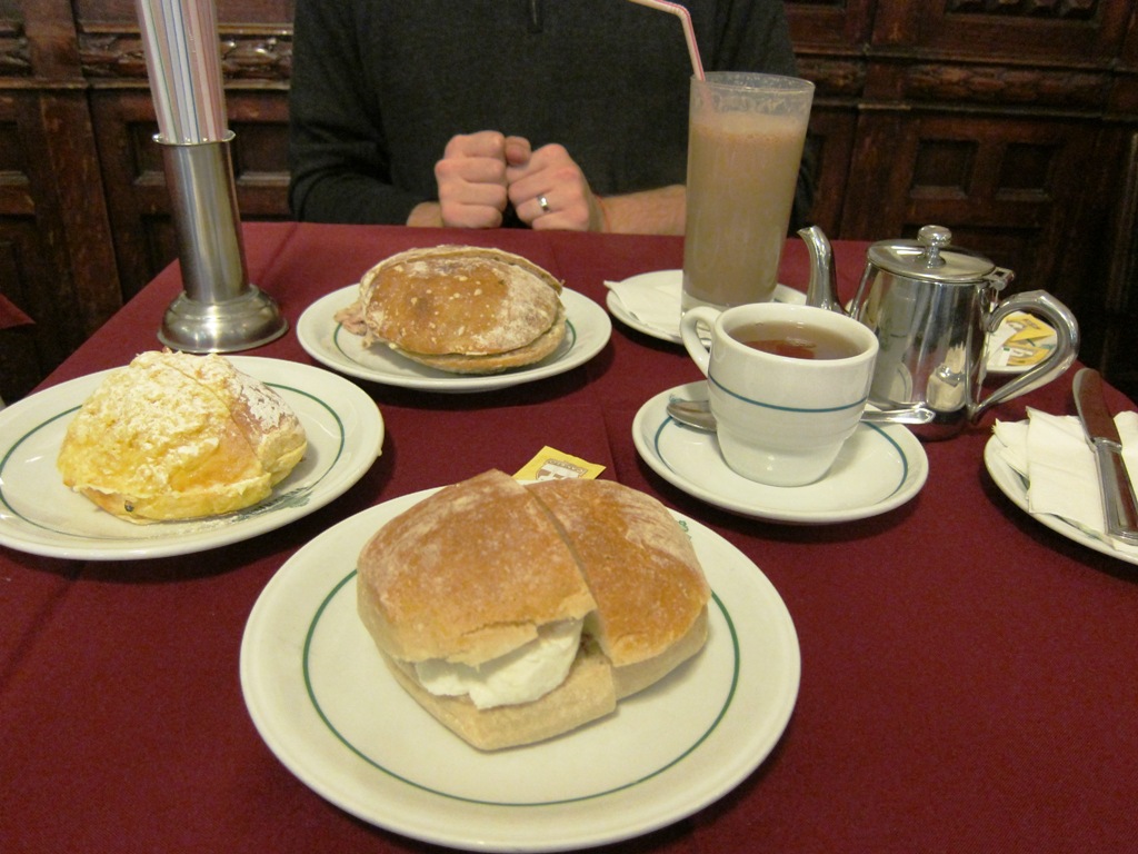 M ordered a turkey sandwich on a Chapada role (which seems to be a cousin to Ciabatta). L ordered a Mafra sandwich with queijo fresco. The light and airy Mafra roll is native to the town of Mafra, just north of Lisbon, and has a slightly sweet flavor. For such a small price, we were surprised at the size of each sandwich, and were impressed with the quality and freshness of the bread. We finished up our meal with a delicate Pão de Deus and an elegant service of Versailles signature tea. The Versailles blend is a black tea with a mix of orange, cinnamon and vanilla, and tasted a little like a subtle citrus chai.