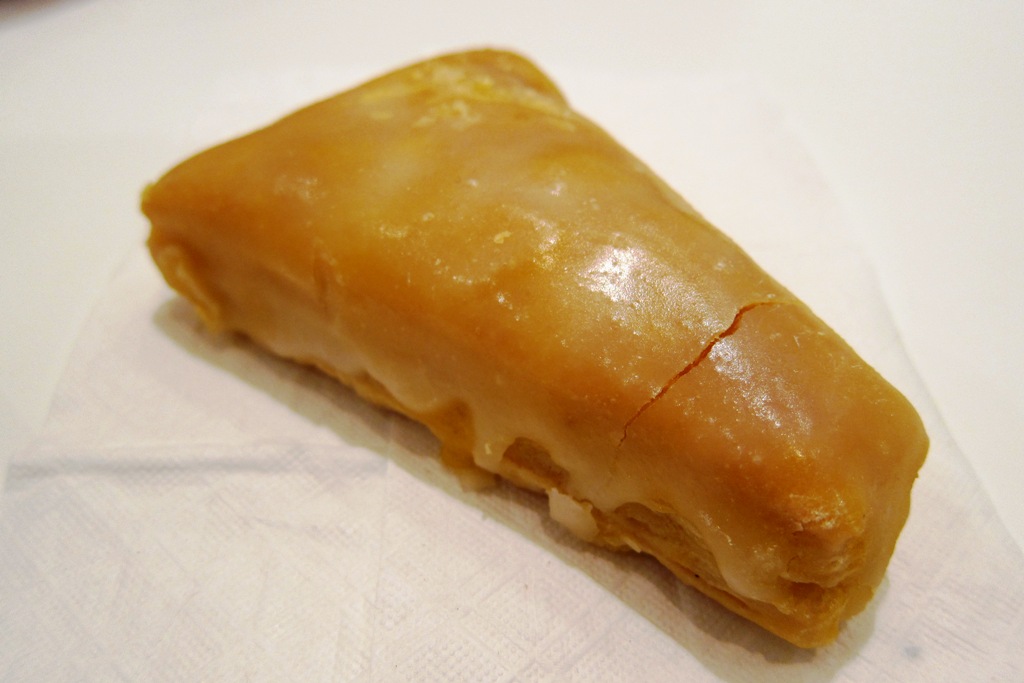 You’re probably thinking – “does that mean Jesuit?” – and yes you are correct – this is the Jesuit pastry, another one of Portugal’s oddly named confections. We’ve previously noted the many religious names of Portuguese pastries, due to the fact that pastry-making was the purview of convents. Even today, many places say they specialize in “Doces Conventuais (convent sweets).” The Jesuíta is a little different than other Portuguese pastries, first for its triangular shape, but also for the fact that it is covered in a frosting glaze rather than egg cream or custard. The Jesuíta is a triangular puff pastry topped with a powdered sugar glaze, and filled with cinnamon egg cream, though in this case the type of filling may vary. Here is a Jesuíta recipe in Portuguese – I have found no recipes for this dish in English.