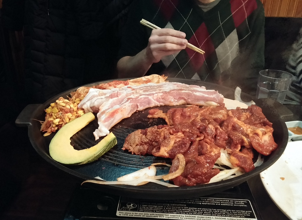 For meat we ordered the short ribs, spicy pork and short steak. Each was billed as about 1 lb of meat, so we figured that one meat dish per couple was sufficient, and we were just about right. At our table there was both a tiny charcoal grill and a circular flat electric grill. Our waitress disappeared halfway through the dinner, so we are actually not sure if we followed the correct protocol at all by taking the meat from the flat grill and putting it on the charcoal grill…. Well no one got food poisoning or burnt, so I think we did alright. We really liked the spicy pork, and the short ribs were also a big hit.
