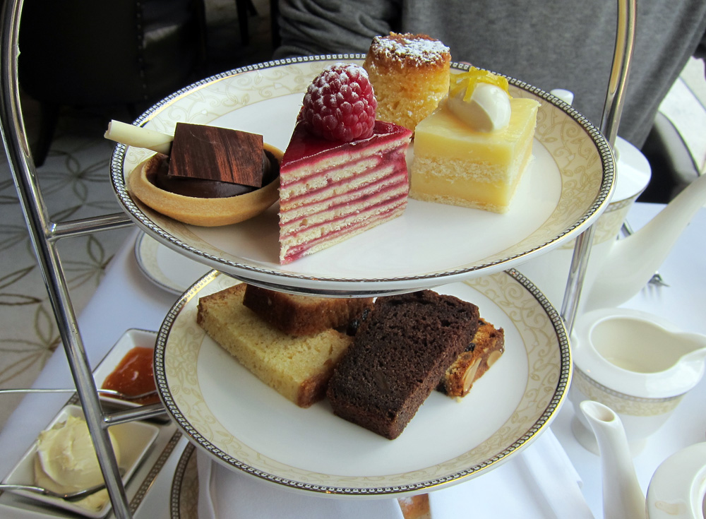 Front and center at this tea time was the tea, which we really appreciated. To help us make up our mind, the tea butler (who knew there were such roles?) presented us with a tea tray with little glass jars of each of the dozen or so teas from Emeyu. We selected the Pu-erh Chai Tea, and the enigmatically-named Leaping Tiger tea – white tea with mango and cornflowers. Other selections included a blooming jasmine and amaranth tea, red fruit infusion, and Lapsang Souchong as well as Japanese and Chinese ceremonial teas. Moreover, we were impressed that the selections even came with brewing temperature instructions. After we ordered our tea, our little tea sandwiches came out in quick order: tuna, chicken, tomato salsa, cheese, and egg salad. These were classic tea sandwiches, simply prepared on crustless bread. Not terribly innovative, but perfect for an authentic London tea experience.