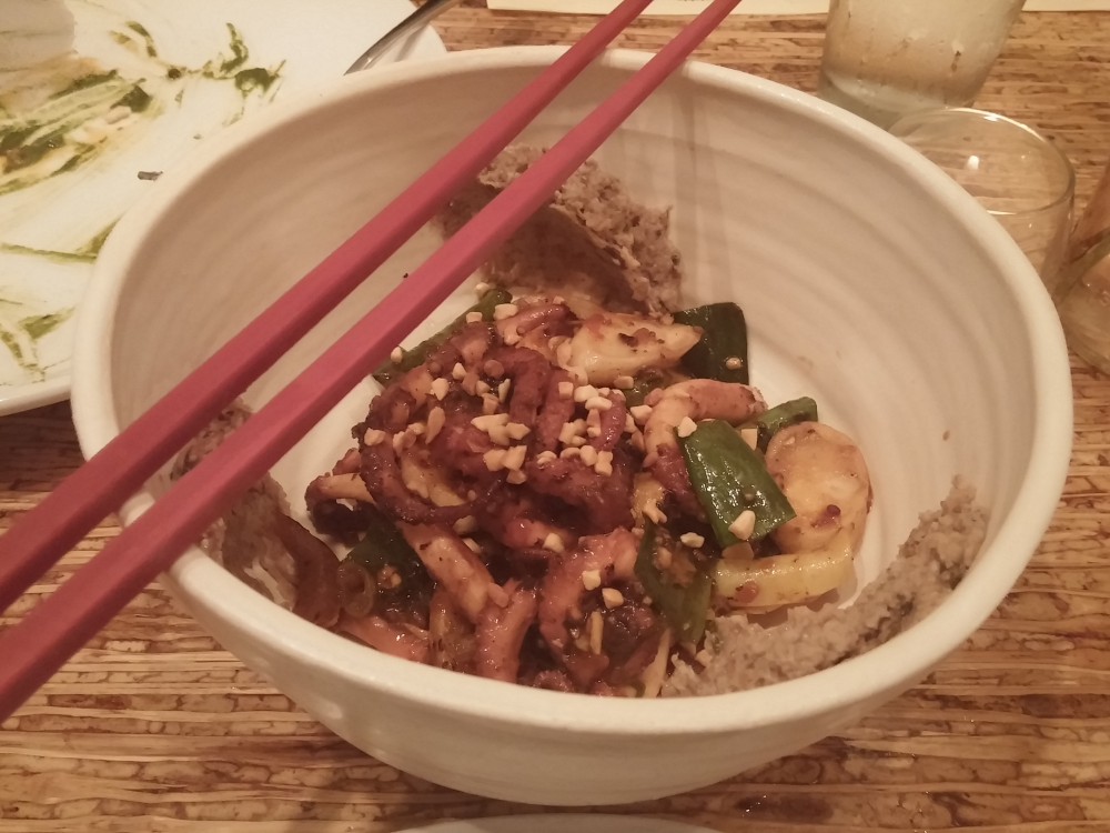 - Charred octopus with black beans and rice cake, oyster mushrooms and scallions ($10) M really liked this one, and even for those among us who are not big fans are octopus, this was a standout dish. The octopus was tender and crispy – not chewy at all.