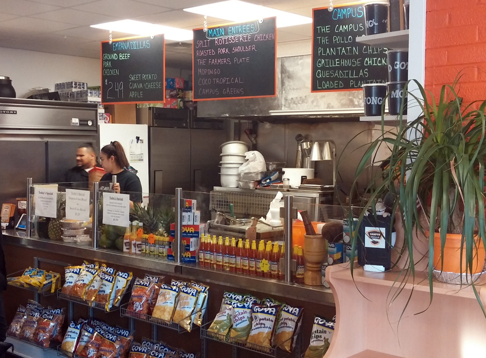 With our Jarritos fruit sodas in hand we waited only a short while for the food to arrive (there were a few tables outside, too). Both dishes were excellent, and the proportions were huge. The mofongo was excellent, and the pork was tender and well spiced, the plantain portion was flavorful and garlicky, and not mushy, which is how we like our mofongo. The coco tropical was delicious, the rotisserie chicken was tender and flavorful, and it would be perfect for those with something a bit more sweet in mind. I think Campus Grille knows that you probably aren’t going to finish your entrée, because they serve everything in round foil to-go containers from the start, and if you don’t finish you can get the plastic lid at the counter. I can see how some people would not like that, but we thought it was kind of genius.