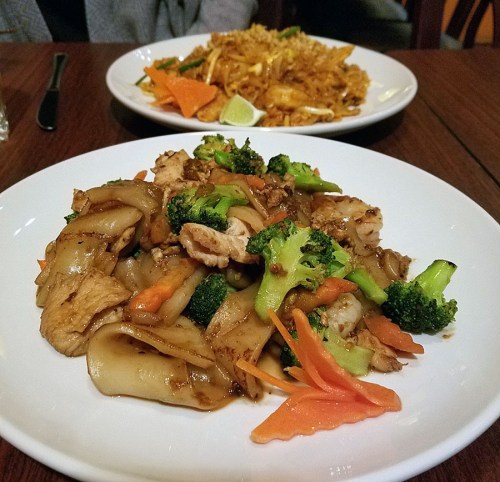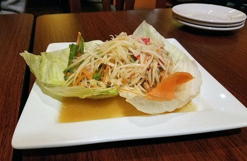 You can get all of your favorite Thai dishes at Banana Blossom, but we feel they are all executed better than you would normally find. The menu has a wide selection of salads, soups, noodle dishes and curries. There are some more unusual dishes like Prik Khing Salmon (Deep-Fried Salmon with String Beans and Our Homemade Prik Khing Sauce – $15.95) and roasted tamarind duck ($18.95). Despite the broad offerings, when we go to Banana Blossom we usually stick with our classics: Pad See Eiw (stir-fried wide rice noodles with chicken and shrimp, eggs, carrots and broccoli – $11.50), and Penang Curry (a medium-spicy curry with chiles, coriander, kaffir lime peel, galangal, bell pepper, string beans, baby corn, eggplant and basil leaves – $12.95). Sometimes we will also start out with a refreshing papaya Salad (with string beans, tomato and peanuts – $8.95), which is also pretty spicy!