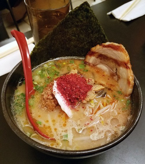 Ramen Misoya is a tiny place with maybe only 8 tables, and a small amount of counter seating, so get there early. The menu may seem overwhelming at first, but there are 3 main varieties of broth to choose from, and you can get 5 versions of meat and vegetable toppings for each broth. The three miso-based broth options are Kome, Mame and Shiro: the Hokkaido-style kome ramen is made with a rice-and-soybean miso, and is the darkest and most full-bodied; the Nagoya-style mame is slightly bitter; and the Kyoto-style shiro is the lightest miso variety of the trio, and was described as having a fruity flavor. All ramen comes topped with ground pork, green onions, sprouts, and menma (fermented bamboo shoots), but with each broth you can can choose from assorted vegetables, Cha-Shu pork, spicy and kimchi varieties ($9-$13 depending on the toppings).