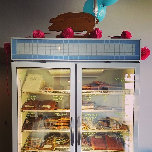 Saucisson is a fell-fledged butcher and you can see back into the kitchen where everything is made – we were also excited to learn that they are offering sausage-making classes – the next one is on Saturday, May 20 (call for details). Saucisson is a labor of love for founders and owners Penny Barend and Melissa Khoury, which started out as a pop-up at Farmer’s Markets, before opening their own bricks and mortar location. The new Saucisson space is clean and bright, with a fully-stocked cooler and freezer full of along with stock, soups, and lard. Saucisson had a variety of beef and pork cuts for sale, alongside a variety of pates, bacon, jerky, rilettes and esoteric sausages, all made/butchered in house. We sampled the German-style currywurst, the Oaxacan black mole sausage and the Filipino longganisa (a sweet breakfast sausage). Quite the spread – though we think the Mole sausage was our favorite! Every week the selection rotates, so be sure to call ahead if you want something specific.