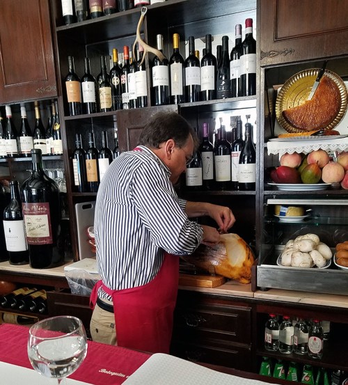 If you want to eat at Boutequim de Mouraria (R. da Mouraria 16A, 7000-585 Évora, Portugal) you have to plan in advance. There are only nine seats, and a single seating for lunch and one for dinner. Moreover, there are no reservations – you have to wait. Our party of 4 got there at 1130 AM for the 1230 opening on a weekday, and there was a family of four already there waiting. Despite these restrictions, we really encourage you to go – this was probably the best meal we had in all of Portugal. The Botequim de Mouratia is basically a bar, where you sit at the counter and watch the master of ceremonies, Domingos Canelas, and his wife Florbela cook a classic Portuguese meal and entertain. The bar itself is tiny and old fashioned, lined with vintage photos, wine bottles and the flags of the nations of every visitor that have dined there (a lot at this point).