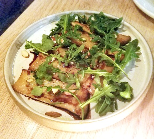 More precisely, the menu is divided into cocktail snacks, antipasti, “Little Fish,” Pasta, “Big Fish,” and Meat. The cocktail snacks are sort of like appetizers for your appetizers: Sicilian olives, prosciutto, house-made mozzarella or radishes with sea salt. Up one level in size are the antipasti, including many interesting veggie-forward combos: Red celery and fingerling potatoes; whole artichoke with mint; and cauliflower with spicy sopressata and pesto. I notice that now they have Bagna Cauda on the menu – which we certainly would have gotten! Our first chosen dish was roasted trumpet mushrooms with balsamic, arugula, and Sicilian almonds (above) – the mushrooms were woodsy, and almost meaty, and went well with the deep, aged balsamic. For a second “lighter” bite, we went with the fennel salad with oranges – one of our favorite dishes that we first tried in Siracusa, Sicily. There is something about the combination of fennel and oranges that is just perfect.