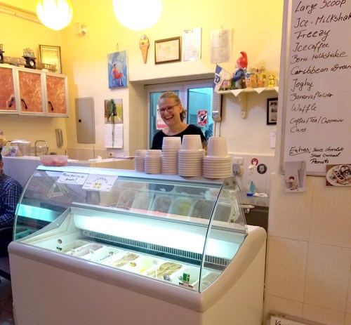 The shop was bright and welcoming, and featured a pin map on the wall of the locations of all the visitors (we couldn’t contribute since the US had already been well-covered). The owners of the shop, Ernst and Babette Wenk were running the show when we arrived, and helped explain all of the available flavors to us. We especially like that they make ice cream in local flavors like hibiscus, guava, pomegranate and doum fruit (which we were not even aware of until this trip). We ordered 3 scoops (15 pounds each) and they gave us a ton of samples afterward. You could also get milkshakes, coffee and even waffles!