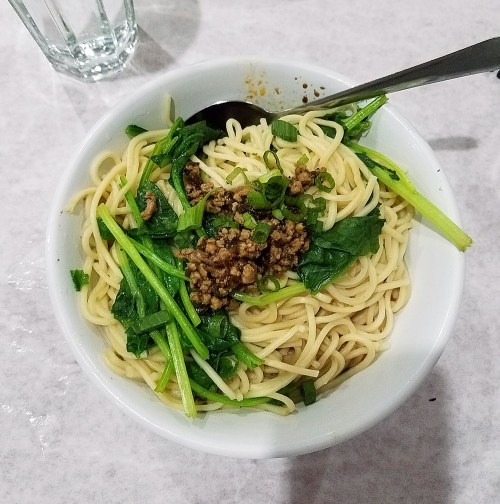 The Chengdu Impression menu includes both Americanized Chinese favorites (orange chicken and General Tso’s) along with a section of Sichuan dishes. We never tried ordering the American Chinese dishes, choosing to stick to the Sichuan side of the menu, but we assume they are good, too! Over the course of our many visits we started to settle on some favorites. First up is a classic dish, the mapo tofu ($13.50, above) tofu cooked in a spicy sauce with the signature numbing Sichuan peppercorns. The version of this dish at Chengdu Impression is our favorite in the city. We also like to start off with a small appetizer portion of Dan Dan Noodles (spicy noodles in a Sichuan peppercorn sauce, below). Another one of our favorites was the dry chili chicken ($14.50), breaded chicken pieces with a mix of chilies, which we have had at other Sichuan restaurants, but we love Chengdu Impression’s version because there is not too much superfluous breading, and still a nice amount of spice. A dish that was new to us was “Ants Climbing a Tree” aka Ma Yi Shang Shu ($13.95), a savory dish with vermicelli glass noodles, ground pork and a spicy sauce. For those looking for something different, a great vegetarian option is the YuShiang eggplant ($12.95) sauteed with sweet and sour sauce (you can also get YuShiang dishes prepared with meat).