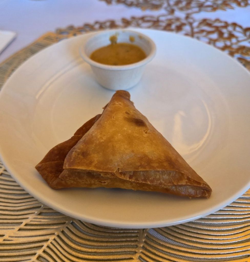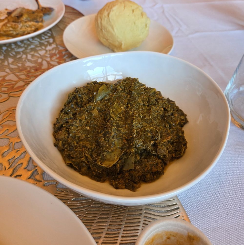 We started off with the sambusas, African cousins of samosas, fried triangular dough wrappers with savory fillings. We got vegetarian, but there is also a meat version. They were delightful and crispy and came with both mild and hot dipping sauces. Other appetizers included fried plaintains and fried cassava. For mains, we got Sombe stew and Goat stew. Sombe is one of the classic dishes of Congolese cuisine, made with pounded cassava leaves, peanuts and palm oil. The goat stew was silky and savory and M particularly liked the addition of the homemade hot sauce. The dish was served alongside a healthy heaping of fufu – pounded cassava – a common accompaniment in Congolese cuisine and other West African cuisines. It serves the same purpose as rice/bread and is perfect for sopping up any sauces and stews. We were absolutely stuffed, but next time we will have to try some of the beignets for dessert.