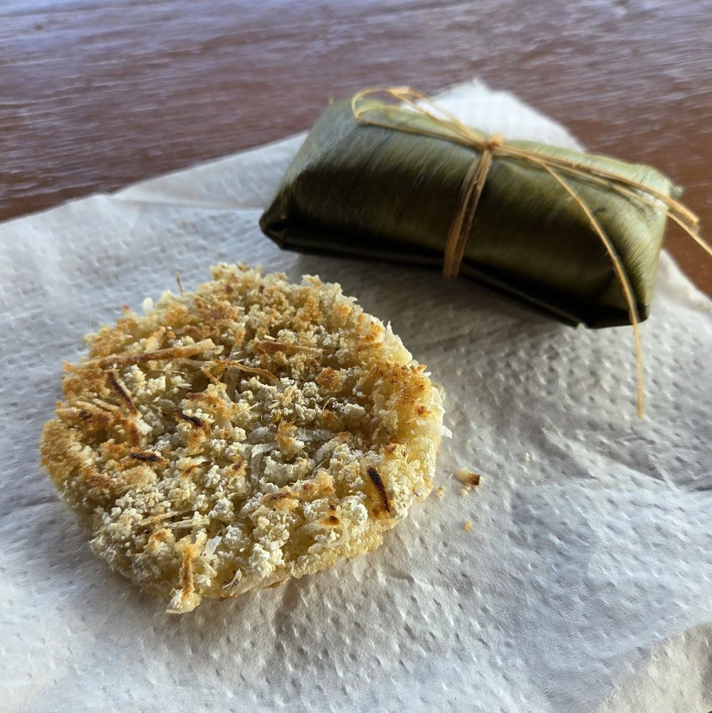 We asked our helpful guide if he knew of anywhere to get cassava bread, and he pointed us to someone who was passing through and selling just that bread right on the spot, Master Lin. Master Lin had a baking business and happened to be delivering some orders to various people at the cultural center. He was not necessarily always there, so we felt very lucky for this coincidence. Fortunately, he had some extras so we were able to purchase both freshly made cassava bread and ducana. Master Lin says he was known for making ducana for decades, but later branched out into cassava bread. Both of the dishes make use of one of the staple ingredients of the Kalinago, and all Dominicans, cassava (also known as manioc). Root vegetables such as cassava are often known as “provision” in Dominica.