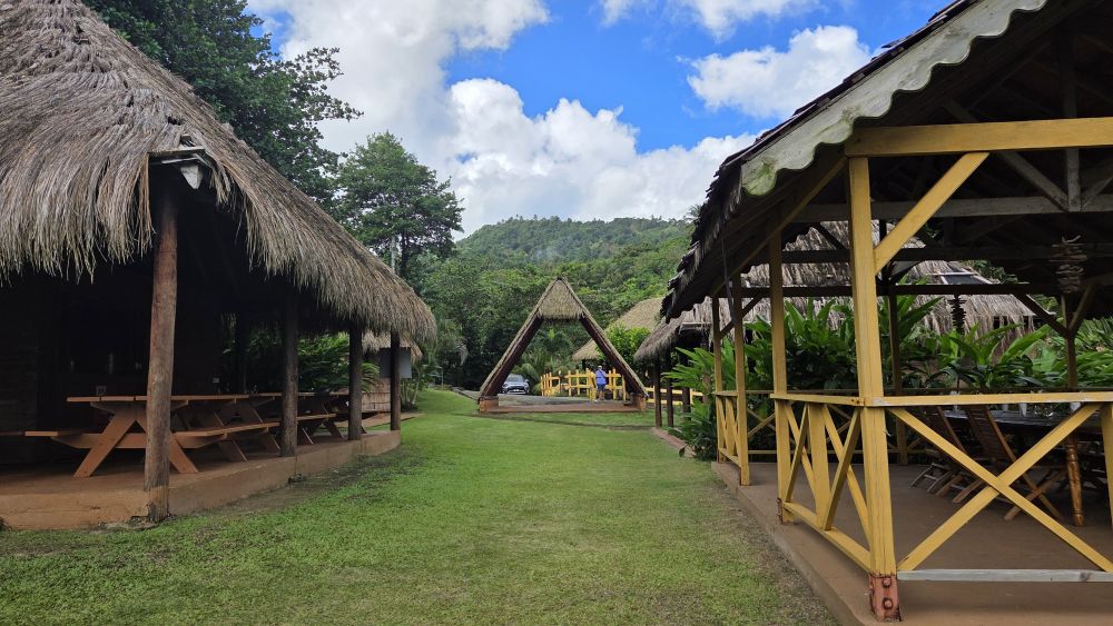 We also learned that there were some indigenous foods and dishes local to Dominica, including cassava bread, that could primarily be found in Kalinago Territory. We had found a few bakeries in the area that claimed to have cassava bread, but one no longer existed and the second was at least closed for the season. We were feeling a bit worried that our quest for cassava bread might be futile. After striking out initially, we visited the cultural center, Kalinago Barana Autê. We had attempted to book a full day or food tour, but it being the holiday season, those were not available. Fortunately, we were able to get a short tour with Austin, a great guide who gave us information about the stunningly gorgeous land and its plants, along with an overview of Kalinago. There was a restaurant and craft shop on site, but no cassava bread to be found.