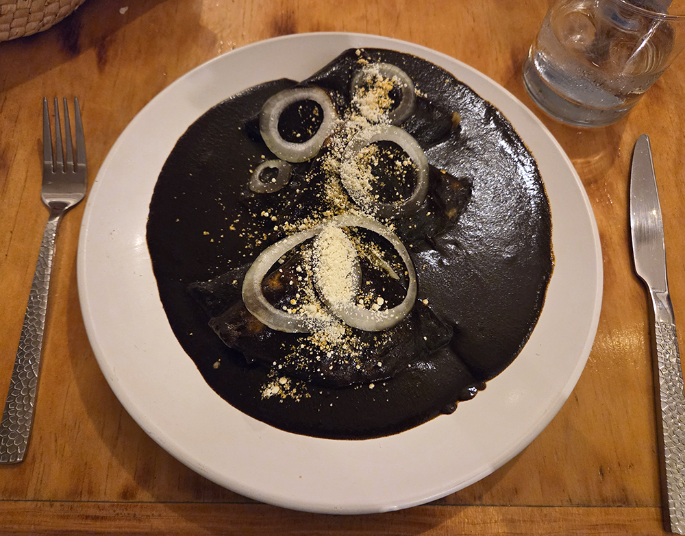 For main courses we were excited to see many regional moles on the menu, for which Oaxaca is famous. Both times I ordered the enmoladas, cheese or chicken triangular-shaped enchiladas in a rich mole Istmeño (seen above). Before visiting this restaurant we were not familiar with this type of mole, but were happy to find that it was similar in spirit to the sumptuous black Oaxacan moles we had tried before (there are also red mole Istmeño varieties). The flavor was complex and rich with smoky, sweet, and acidic notes. Having sampled moles across many restaurants in Oaxaca, Totopo Güero’s mole Istmeño was our favorite mole in the city. On our various visits to Totopo Güero we tried the mole de Hierbasanta – made with hierbasanta, guajillo, jalapeno, and serrano chiles – served over totopos, akin to thick tortilla chips (from where the restaurant gets its name). Another favorite was the Costilla de Puerco Horneada, pork shoulder with guajillo and red ancho chiles, over a potato puree.