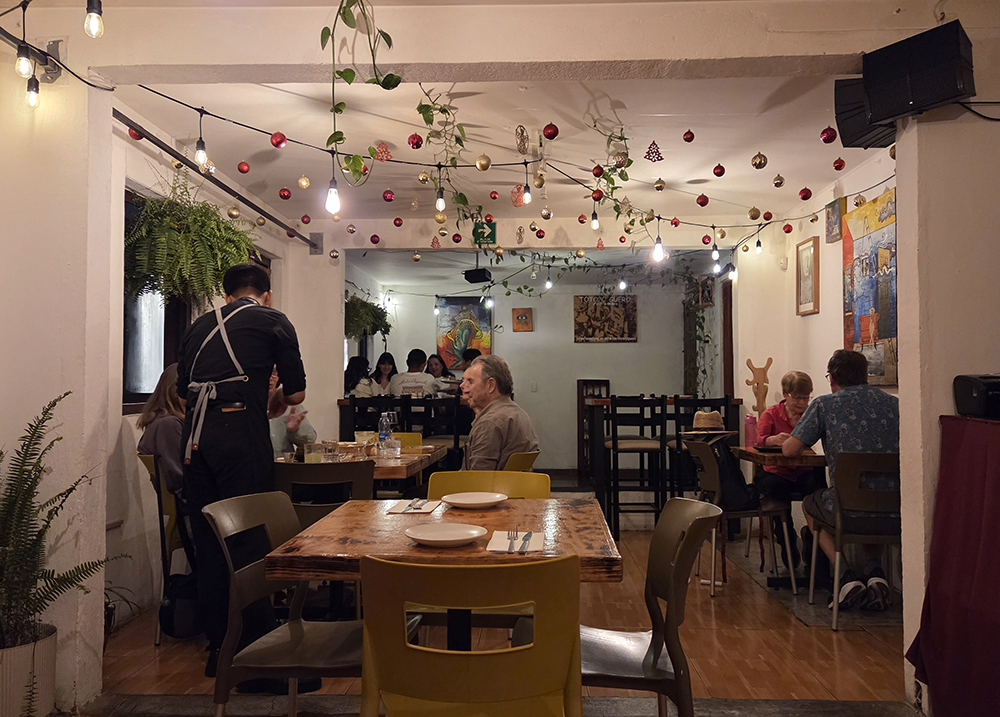 Totopo Güero is a small restaurant located on the second floor of a building right in the heart of the historic center of Oaxaca. The restaurant’s service and ambiance are very welcoming, and being just set off of (and above) the main drag lends a calm atmosphere. The menu itself is small and well-edited, featuring many hyper-regional Oaxacan dishes. To start, the menu highlights many appetizers that are unique to Oaxaca including tlayudas and garnachas. These are both classic street foods on a masa base, slathered with beans cooked in lard. The tlayudas are thin, large and crispy (and can come with a variety of meat toppings), while the garnachas are smaller and thicker. Other featured appetizers include fried empanadas, fried plantains, and tamales.