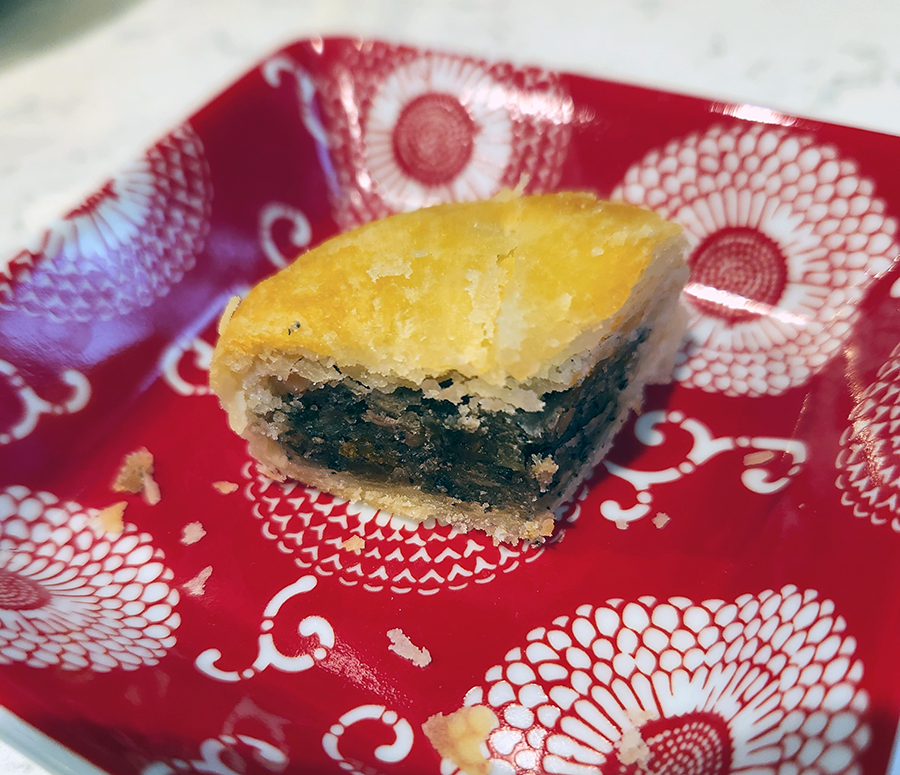 In China, one of the most emblematic dishes for the Mid-Autumn Festival, celebrated throughout East Asia, is the mooncake, a beautiful sweet with a thin, chewy skin and a myriad of fillings. However, today we were introduced to an intriguing variety of mooncake unlike any other variety we had seen: Suzhou or “Su” style mooncakes. This style of mooncakes from the city of Suzhou in the Yangtze River Delta has a different kind of “skin,” instead consisting of a shell of undecorated, multi-layered, flaky puff pastry! The filling for Suzhou mooncakes can be either sweet or savory, which is atypical of other mooncakes. To prevent any surprises, a red mark on top often distinguishes the sweet mooncakes from the savory. The version I tried was filled with sweetened squash, nuts and black sesame, though red bean is also typical. If you would like to make your own savory version, Food 52 and the New York Times have versions stuffed with pork, while the Woks of Life has a sweet red bean version.