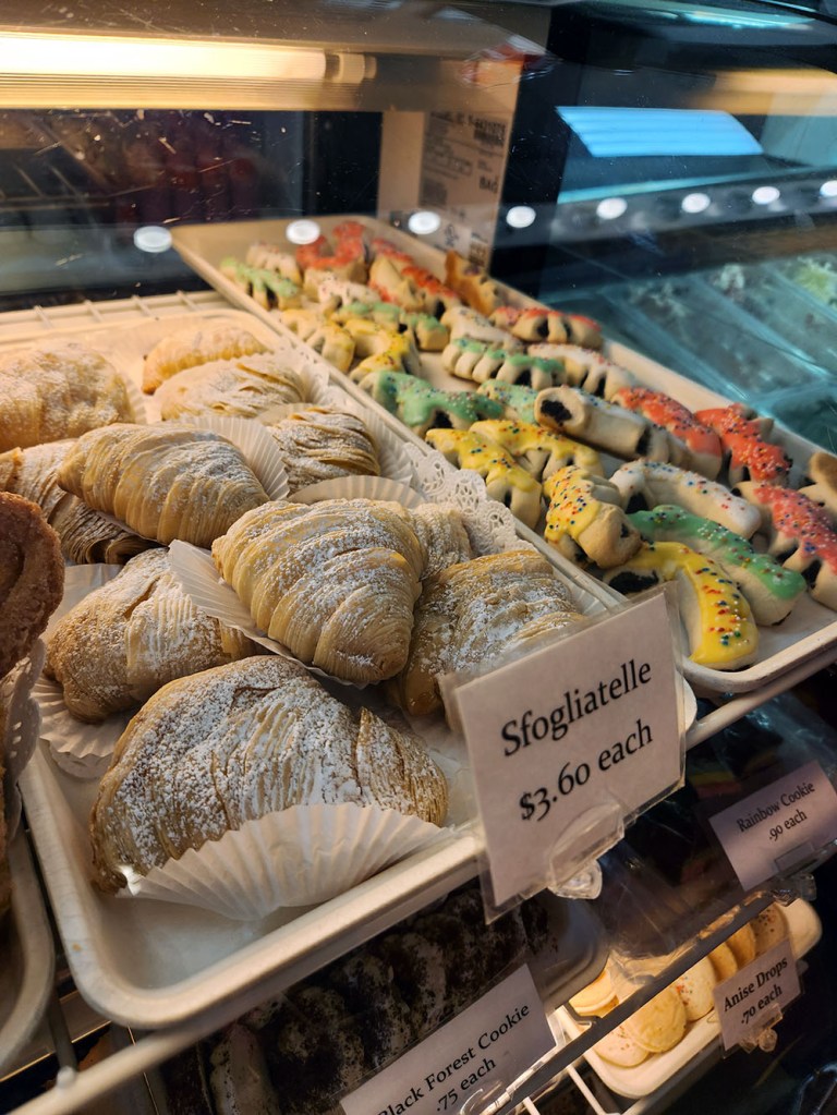 Of course, they also have many pastries, Italian and otherwise: rum baba, cream puffs, eclairs, mini cassata cakes, and holiday specials like the St. Joseph’s Day zeppole. The cannoli are filled to order with the somewhat unorthodox half chocolate and half vanilla cream by default. All of the pastries are delicious, and who can resist a fresh cannolo? This time around, we tried the eclairs for the first time, and M particularly approved, especially since it was filled with chocolate cream. The sfogliatelle are one of L’s favorites, and she also appreciates how they are one of the few places where you can get an authentic mini Sicilian cassata cake (covered in green marzipan and filled with cake and cream – similar to Swedish princesstarta).