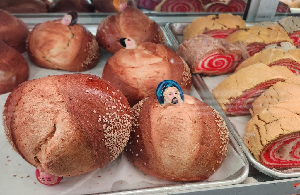 In Chicago, we frequently enjoyed pan de muerto, traditional Mexican bread for Dia de los Muertos, from one of the many local panaderias. In the US, the pan de muerto we bought was usually a sweet brioche roll with two crossed “bones” on the top. Since pan de muerto is hard to find in Cleveland, we have previously made our own using the Chicano Eats recipe, which came out great. On a recent trip to Los Angeles in late October, we knew we wanted to find some pan de muerto in person. During our LA research, we came across some places specializing in regional Oaxacan pan de muerto, which is a bit different than what we are used to. These breads are also lightly sweetened, but are covered with sesame seeds, and may take the form of larger doll shapes or rounds. They also come with colorful, adorable miniature faces made from hardened masa and painted in vibrant hues. It is relatively hard to find recipes in English for this Oaxacan-style bread, but you can look at a photo story from Vogue Mexico.