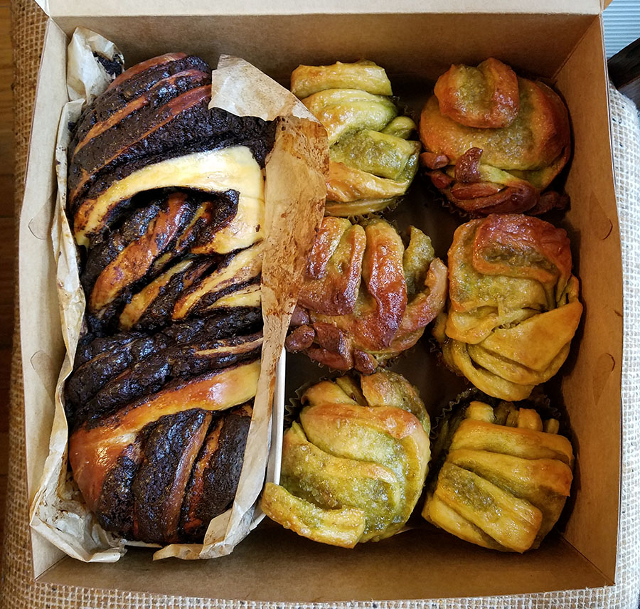 Of course, the delicious and strong coffee and tea, elegant surroundings, and late operating hours are the main draws to these Yemeni cafes. However, another major attraction is a new-to-us dessert: “honeycomb” cake/bread, more properly known as Khaliat Nahal / Nahl. Khaliat Nahal (which literally means “bee’s hive/beehive” in Arabic) is a classic Yemeni dessert that seems to be on offer at all of these cafes, often alongside crepes, cookies, or milk cakes (another Middle Eastern specialty based on the Latin American tres leches cake). Khaliat Nahal is a leavened bread with a cream cheese filling, topped with honey and sesame and/or nigella seeds. It is formed from pull-apart pieces of dough shaped in a round honeycomb-like pattern (which reminds us of a more-organized monkey bread). There is something extremely visually-satisfying about this geometric bread, and we like that you can sometimes customize how sweet you want it to by adding your own honey topping. If you are feeling ambitious you can even make your own honeycomb bread at home! Check out these recipes from Strawberry in the Desert and Every Little Crumb. For now, I think we will look forward to getting this sweet bread at our local Yemeni cafes as a special treat.