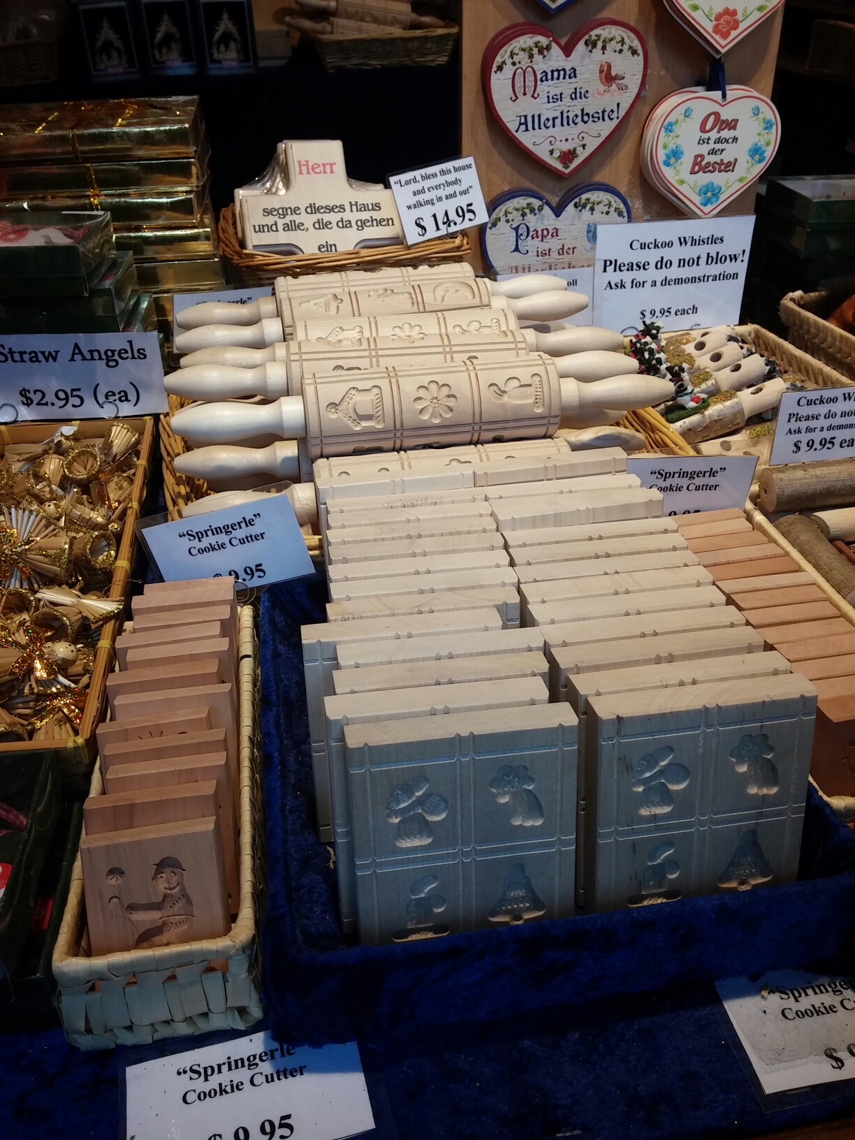 While at the Christkindlmarket in downtown Chicago we spotted these unique rolling pins and cookie molds amidst the wooden ornaments and whistles at a German handicrafts stand. Far from just being decorative, these “Springerle” pins and molds are used for imprinting designs on traditional German cookies of the same name. Springerle cookies are easy to make, and are basically sugar cookies flavored with anise, as in this recipe. However, traditional recipes call for a more unusual ingredient – baker’s ammonia. What makes these cookies really distinct are their festive designs, which may be stars, hearts, flowers, animals, people, or anything you might imagine. Springerle pins and molds have been common across Germany for centuries, and some of the antique designs truly are artful. If you are not near a German market, you can buy a wide variety of springerle pins or molds online.