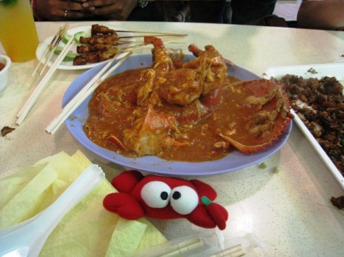 Chilli Crab is the national dish of Singapore – a whole fresh crab cooked in a spicy tomato and chili broth. We’d been craving Chilli Crab for about a year before we went to Singapore, when the dish was introduced to us by way of a recipe attached to a miniature chilli crab stuffed animal, who took part in our chilli crab adventure below. There’s nowhere to get it in Chicago, and we are definitely not ambitious enough to do it on our own in seafood-starved hometown (Here’s a Recipe if you feel like DiY-ing it). We saved our chilli crab experience for our last hawker center experience in Singapore, saving the best for last, you could say.