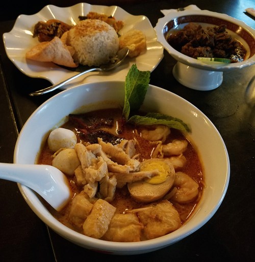 We started out with a roti with vegetable curry (clearly showing influence from India). The roti flatbread was nice and flaky and the curry was mildly spicy and flavorful, and we appreciated that we could get the curry in chicken or vegetarian varieties. After only a little deliberation, we ordered our two favorite Malaysian dishes, beef rendang ($13.95) and laksa curry noodles ($13.95). The laksa noodles came in a coconut milk curry broth with char siu BBQ pork, shrimp, fish balls, a hard-boiled egg and “tofu puff.” Tofu puffs are fried, small pieces of tofu that somehow manage to have an airy texture, and Serai’s were exactly like what we had in Malaysia. The beef rendang ($16.95) is beef in a spicy dry curry sauce with lemongrass and ginger, served on a banana leaf with sides of rice, eggplant and string beans. The beef was extremely flavorful, and extremely complex, with just a hint of heat.