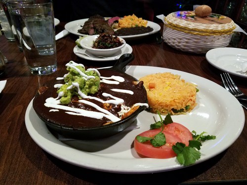 Main dish: Zegueza. Boiled chicken served in a sauce of specially-prepared corn (trust us, no way to make this at home), guajillo chiles, tomatoes, and onions, served with some leaves of hierba santa.