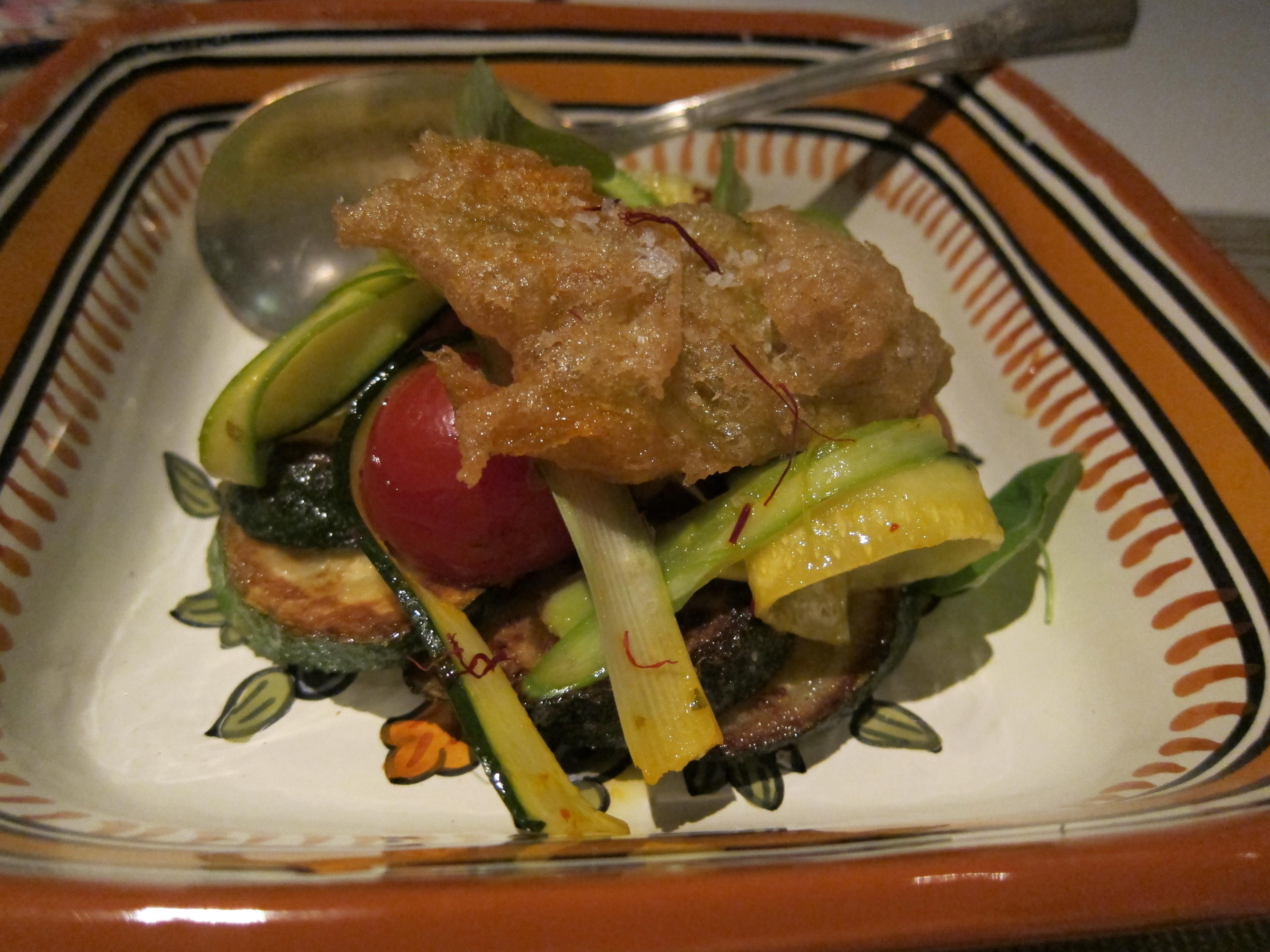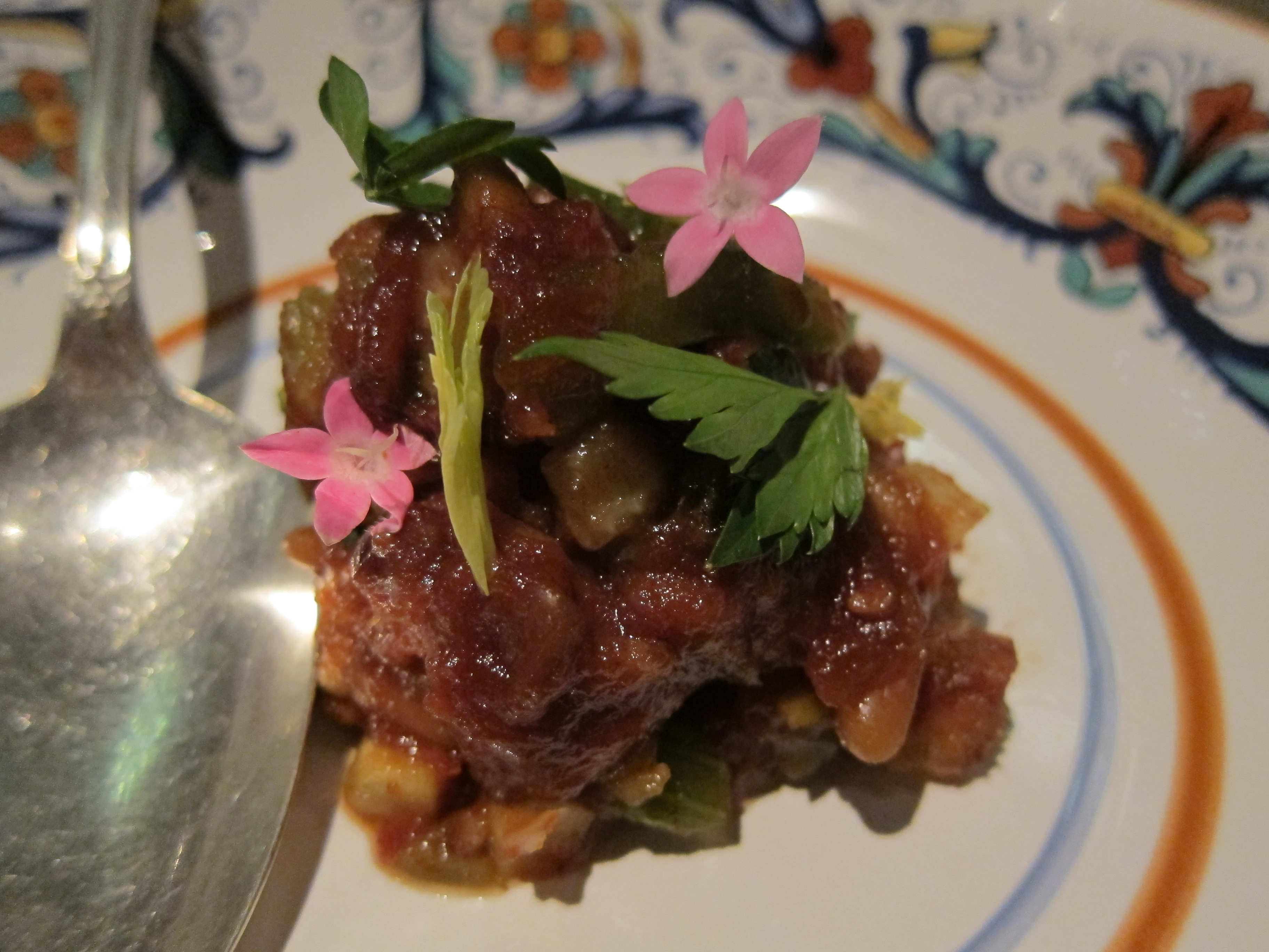 “The whole garden in a dish” is how our waiter described our third antipasta, a wonderful take on caponata. A variety of vegetables accompanied with the perfect dose of a wonderful sweet-and-sour tomato sauce. The pink Egyptian star flowers, said the server, were delivered only minutes before service began that evening, and so were a last-minute addition to the dish.