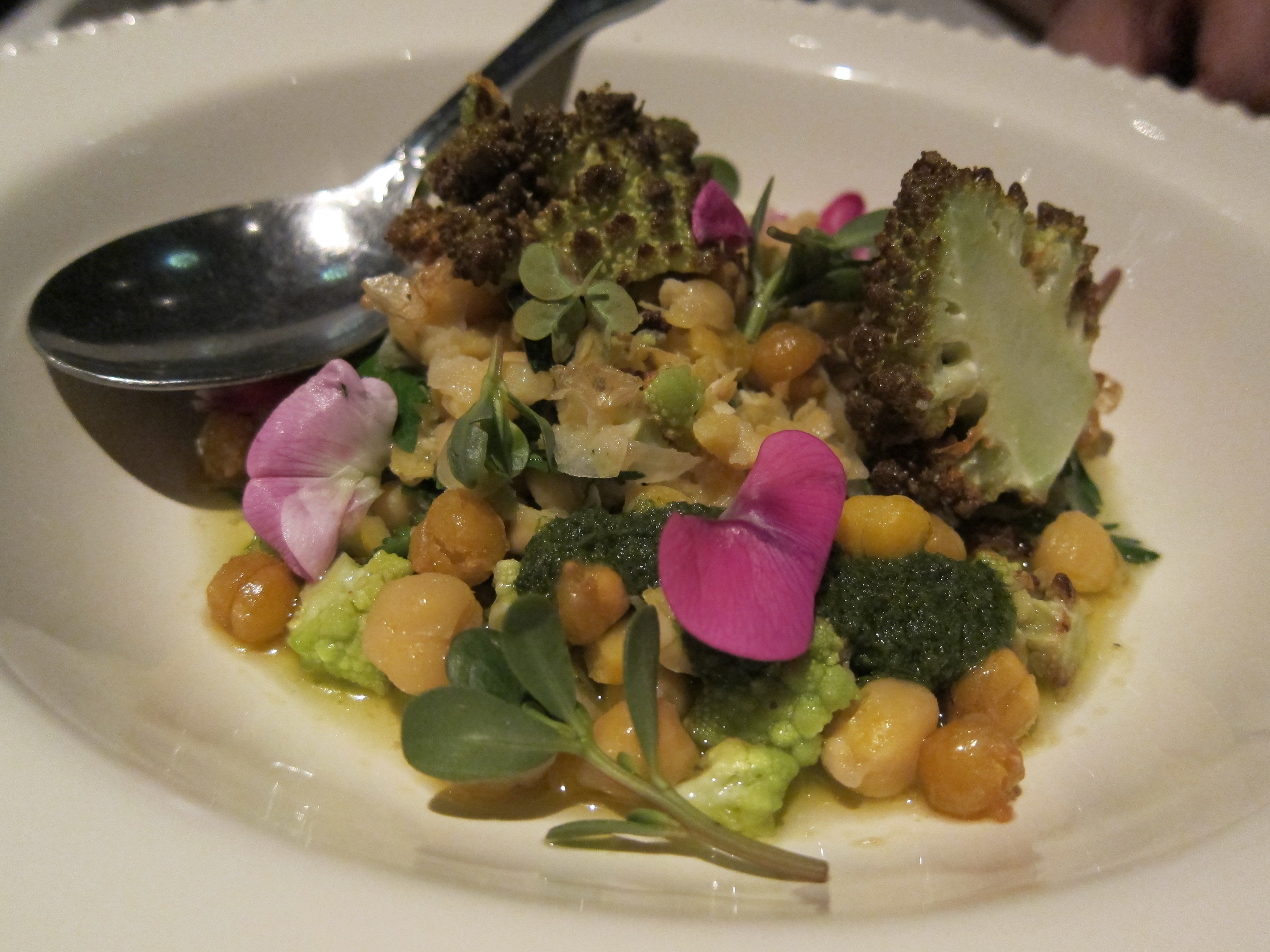 Our fish course was grilled swordfish with mint pesto, served topped with a bunch of grilled mint and a charred head of garlic. On its own, the swordfish was a bit of a disappointment given the wonderfully complex flavors that had emerged thus far in the course of the evening. Lightly seasoned with salt and pepper and nicely grilled, even with the mint pesto we found the flavor a little underwhelming in the context of the rest of the meal. This changed once the fish was eaten with a bit of the accompanying salad: chickpeas, basil, and Romanesco (“fractal”) broccoli in lemon juice. This small salad added exactly what the fish had been missing: a little vibrancy of citrus, contrasted and paired well with the mint pesto.