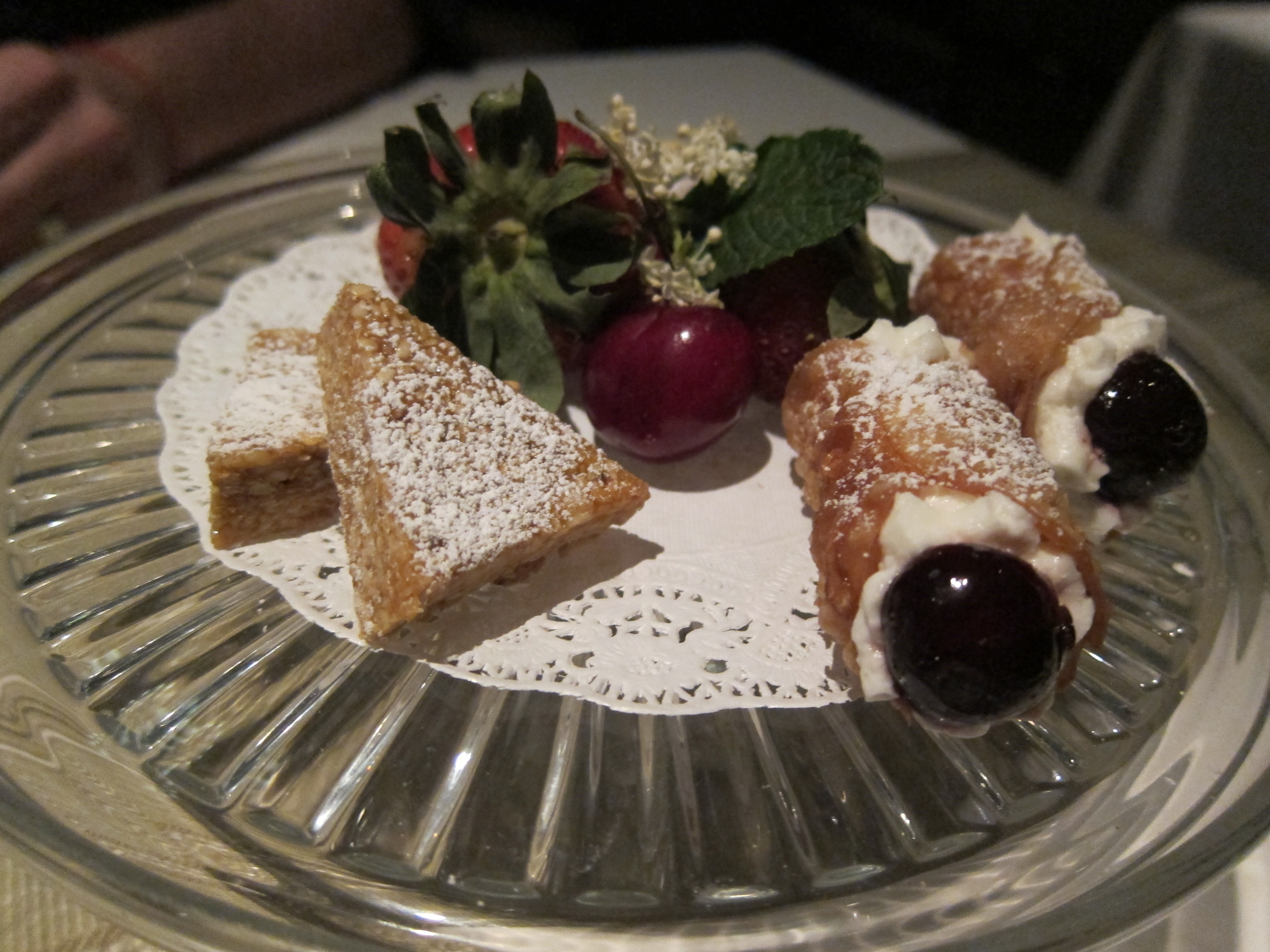 This was a very smart part to include in the meal: something light and cool to cleanse your palette and allow you to digest before taking on dessert. Apparently (said the server) the Arabs developed shaved ice while in Sicily, and they were also the first to cultivate the islands wide array of citrus fruits for which Sicily is justifiably well-known. The granita at Next was unpretentious, nothing more than ice flavored with blood orange juice (and thus quite sour), but a welcome interlude before Sicily’s most famous product: dessert.