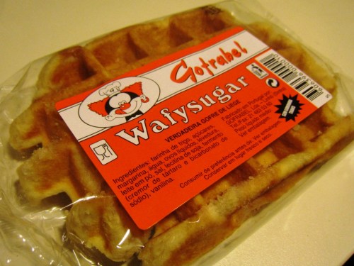 What is sold in vending machines can tell you a lot about the culture of a country. Here in Portugal they sell waffles. When we first saw the “Wafysugar” in a subway vending machine, we did a double-take. It was the first time we had seen waffles in a vending machine, and waffles aren’t a popular breakfast food here, though they are pretty common in gelato shops. We love waffles and usually have them every weekend, thanks to a well-loved registry gift (sadly, our waffle iron is back across the Atlantic). Out of curiosity, and waffle withdrawal, we felt we had to try a Wafysugar after seeing them everyday in the subway. For one Euro, we figured it was worth a shot. The Wafysugar, billed as a “Gofre de Liege,” was about the size of a quarter of a Belgian waffle. Surprisingly, the ingredient list for the Wafysugar was not terribly long, containing mostly decipherable ingredients. It was a tad chewy, very sweet and though it did indeed taste like it came out of a vending machine, it was not entirely bad. Despite the relative palatability of the Wafysugar, we’ll leave the vending machine purchases to water and soda from now on.